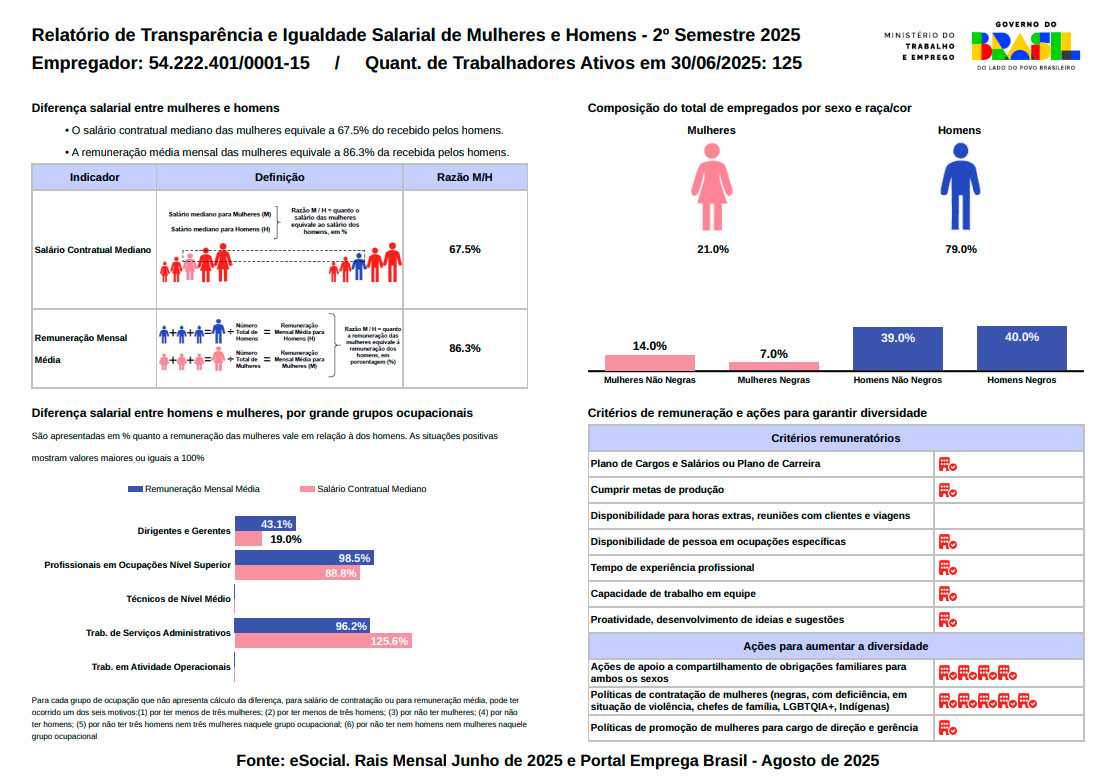 Conforme determinação estabelecida pela Portaria MTE nº. 3.714 de 2023 e pelo Decreto Federal nº 11.795 de 2023, que regulamentaram as obrigações oriundas da Lei de Igualdade Salarial (Lei nº. 14.611 de 2023), todas as empresas com mais de 100 empregados devem publicar semestralmente o relatório disponibilizado pelo Ministério do Trabalho e Emprego (“MTE”), contendo as médias e medianas das remunerações anuais, este primeiro baseado nos dados do eSocial de dezembro de 2022 e com a utilização do CBO (Código Brasileiro de Ocupações).